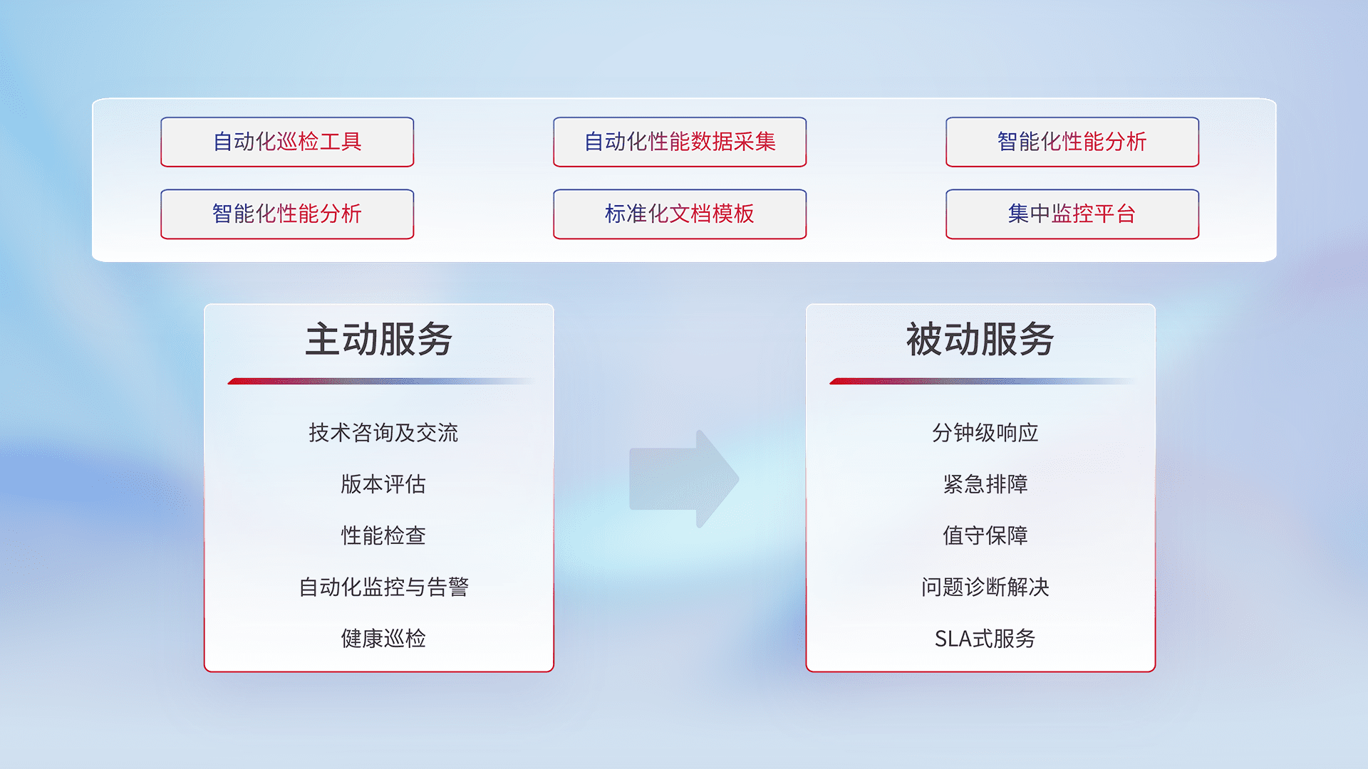 智能化工具和标准化文档,,保障服务质量,,提供主动服务(包含技术咨询、、版本评估、、、、性能检查、、、自动化监控与告警、、、、健康巡检)和被动服务包含(分钟级响应、、紧急排障、、、、值守保障、、、问题诊断解决、、SLA服务)。。